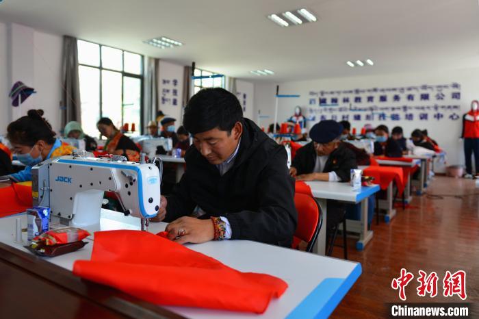 西藏山南森布日極高海拔地區(qū)生態(tài)搬遷安置點(diǎn)的牧民正縫制紅領(lǐng)巾。江飛波 攝