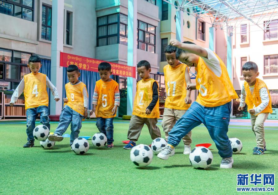西藏自治區(qū)實驗幼兒園大班的孩子在進(jìn)行足球訓(xùn)練(2019年8月22日攝)。新華社記者孫非 攝
