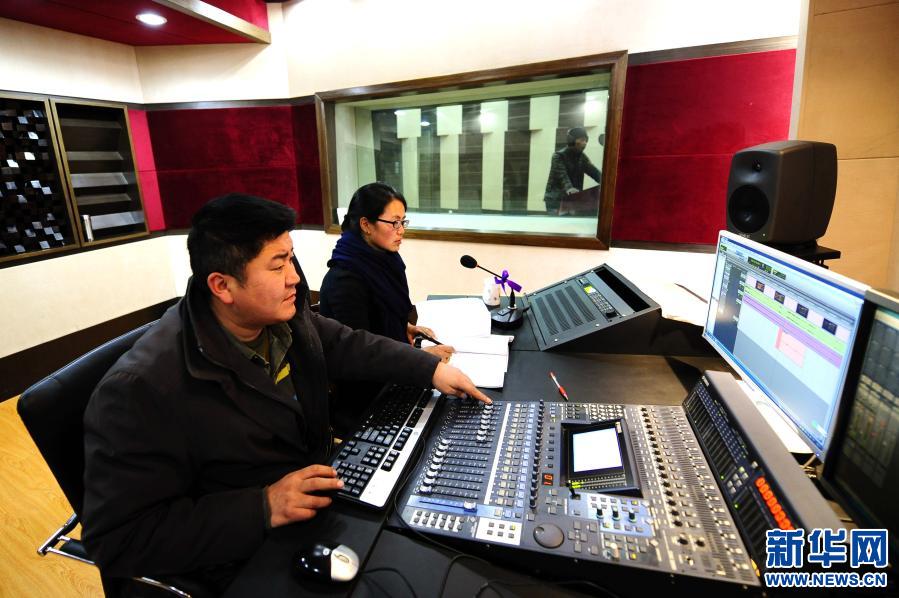 在中國西藏廣播電影電視藏語節(jié)目譯制中心,工作人員正在為影片《催眠大師》進行藏語配音(2015年12月11日攝)。新華社記者晉美多吉 攝