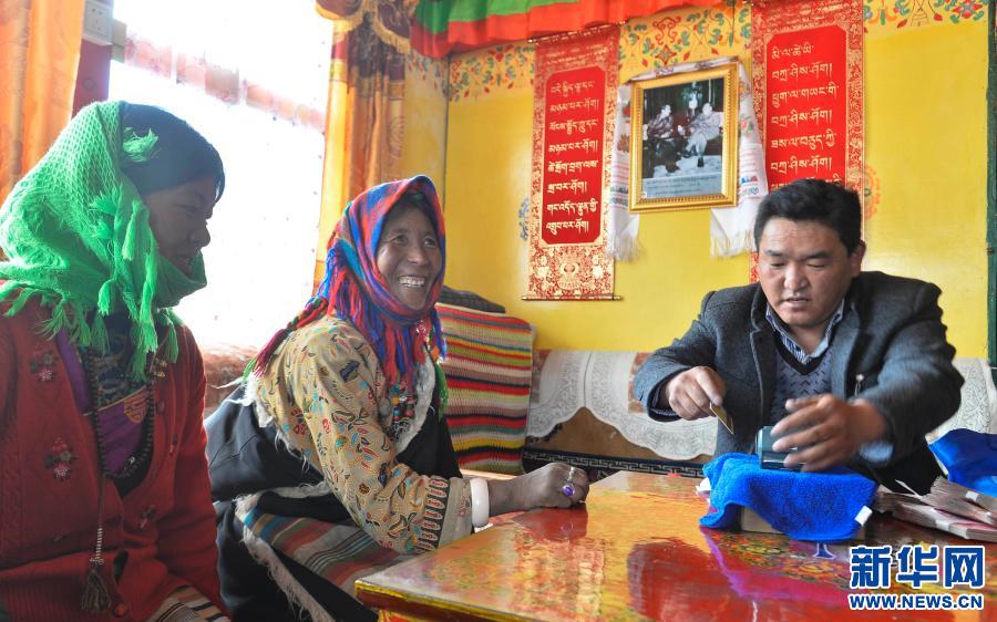 西藏日喀則市薩嘎縣達(dá)吉嶺鄉(xiāng)薩嘎村牧民在助農(nóng)取款服務(wù)點刷卡取款(2014年4月27日攝)。新華社記者 普布扎西 攝