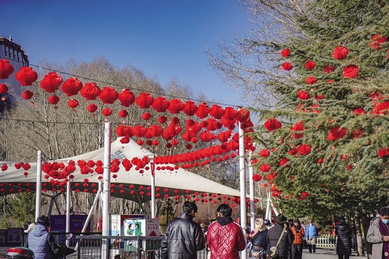 “日喀則新年已經(jīng)開始,但我因?yàn)楣ぷ髟驔]能回去。今天過來公園散步,看到掛著的紅燈籠,一下子就有年味了,感覺公園都變得更漂亮了?!眮碜匀湛t市江孜縣的白瑪央金說。