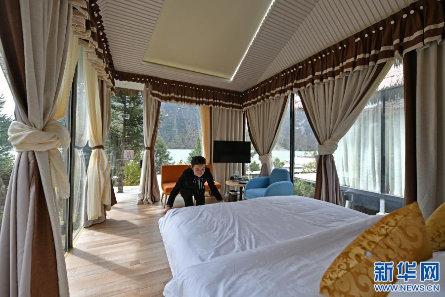 然烏國(guó)際自駕·房車露營(yíng)營(yíng)地是西藏昌都市八宿縣招商引資的旅游產(chǎn)業(yè)扶貧項(xiàng)目,2018年3月正式營(yíng)業(yè)。圖為一名營(yíng)地工作人員在湖邊的星空房?jī)?nèi)整理房間(2019年5月24日攝)。新華社記者 李鑫 攝