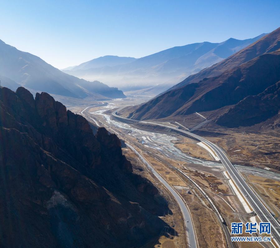 這是拉薩至那曲間的交通線路(1月28日攝,無(wú)人機(jī)照片)。從左到右依次為109國(guó)道、青藏鐵路、高等級(jí)公路。新華社記者 孫非 攝