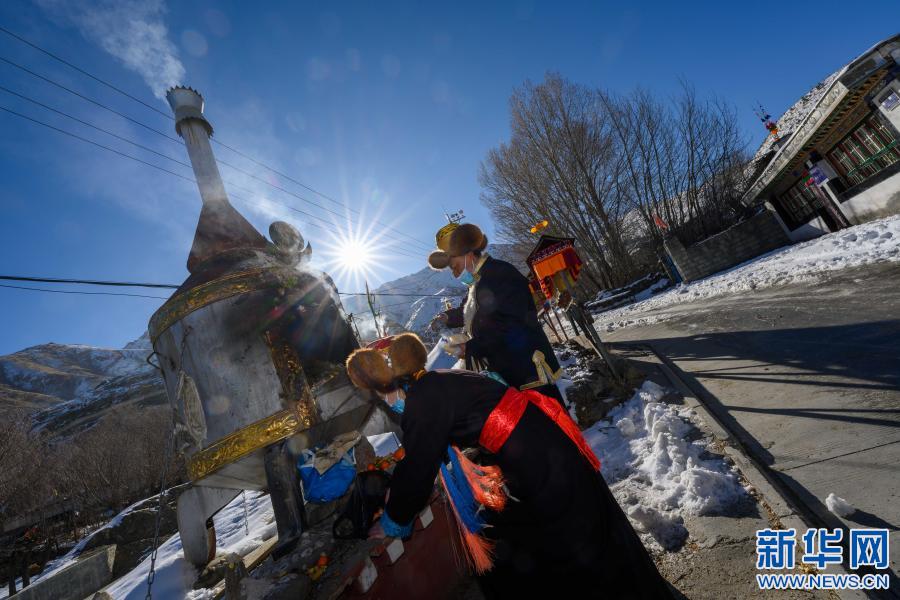 2月12日,在西藏自治區(qū)山南市乃東區(qū)澤當鎮(zhèn),格央和父母一起,在藏歷新年第一天轉山祈福。這是格央(前)和父親一起煨桑。新華社記者 劉金海 攝