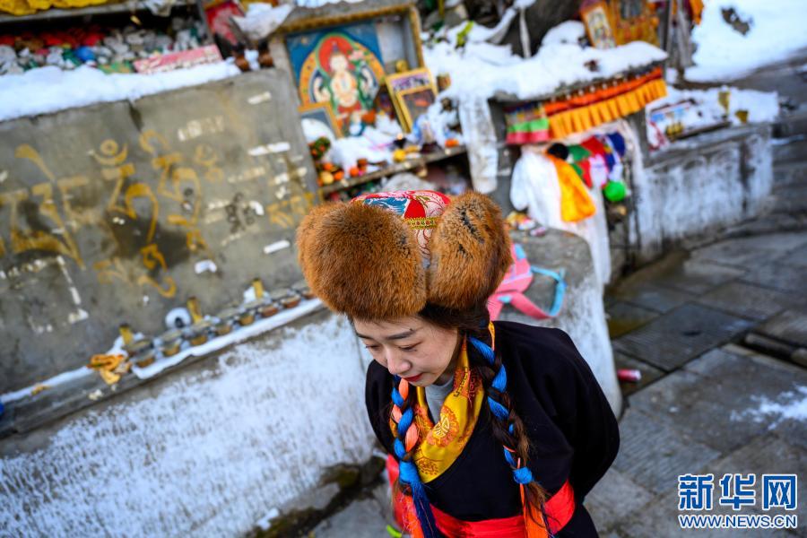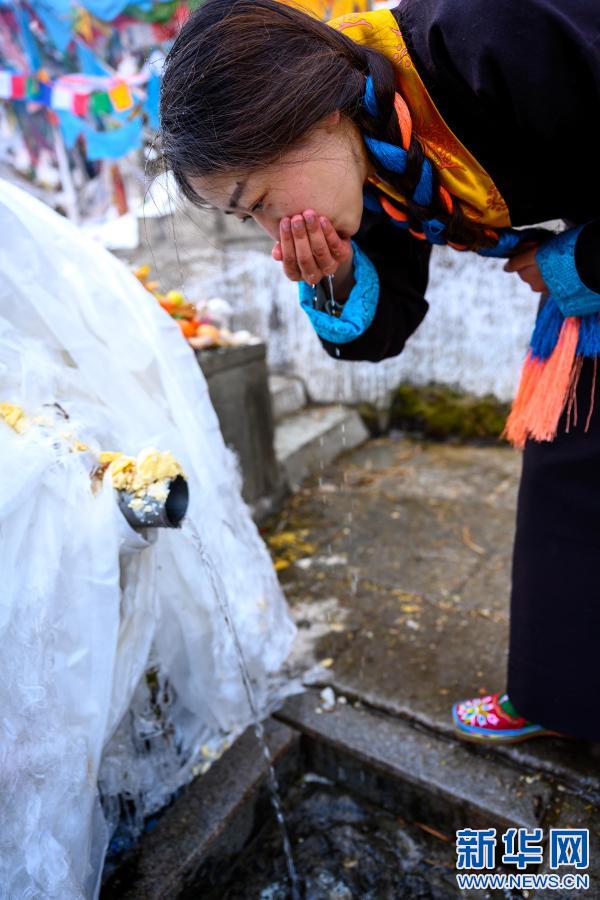 2月12日,在西藏自治區(qū)山南市乃東區(qū)澤當鎮(zhèn),格央和父母一起,在藏歷新年第一天轉山祈福。這是格央在飲用“吉祥水”。新華社記者 劉金海 攝