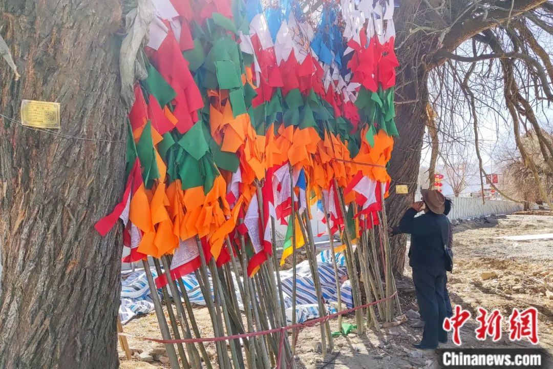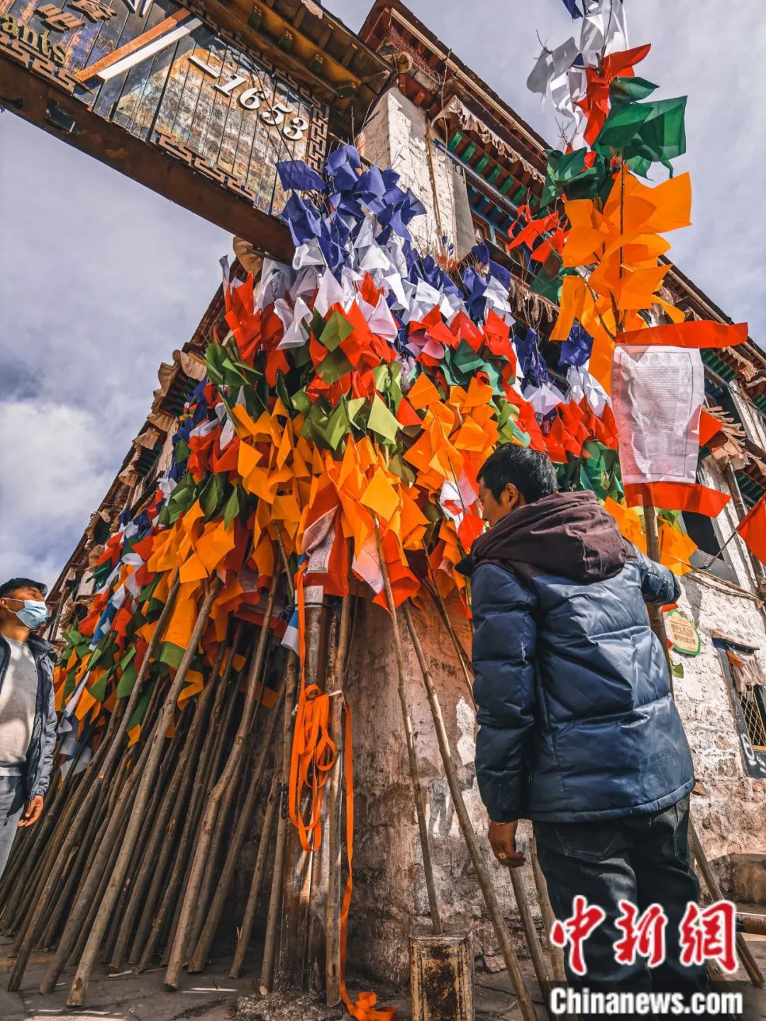 根據(jù)傳統(tǒng),西藏民眾會在藏歷新年初三前后將屋頂、山頂、湖邊等地懸掛的五彩經(jīng)幡進行更換,祈禱新年吉祥如意、五谷豐登。
