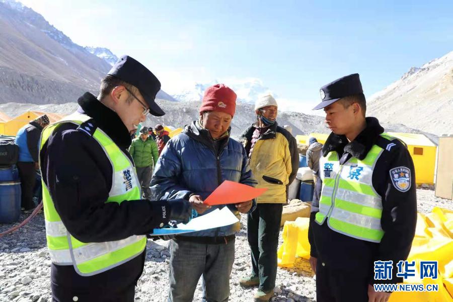 在珠峰大本營執(zhí)勤點,民警開展普法宣傳(2月攝)。新華社發(fā)(鄭勁松 攝)