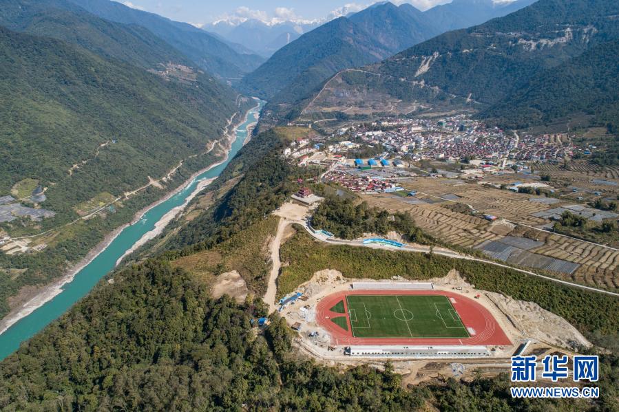 這是墨脫縣新修建的11人制足球場(2月13日攝,無人機照片)。新華社記者 羅博 攝