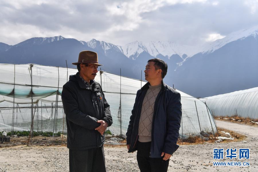 陳千(右)和甲日卡村黨支部書記多多在溫室前商討怎樣促進村民增收(2月25日攝)。新華社記者 晉美多吉 攝