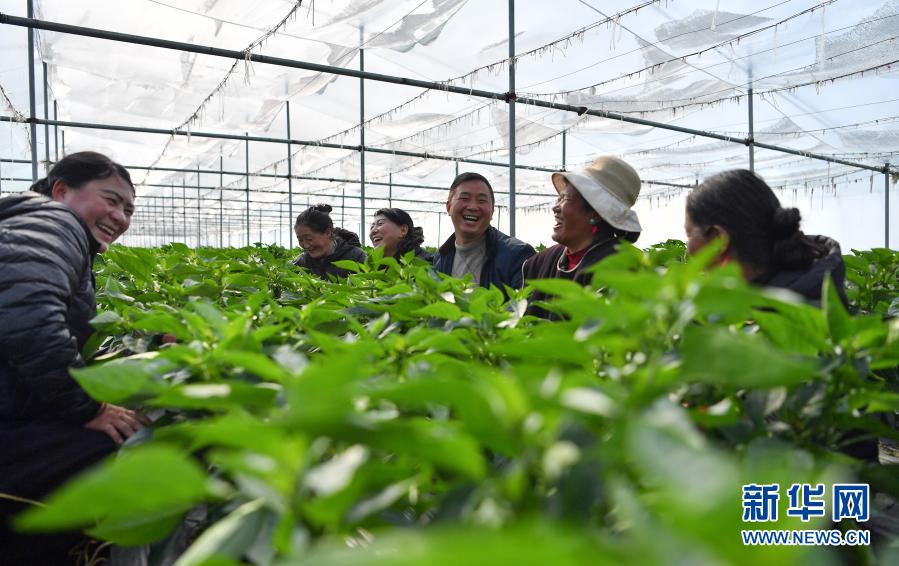 陳千(中)和種植戶在大棚里查看蔬菜長勢(2月25日攝)。新華社記者 晉美多吉 攝