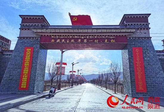 克松社區(qū),距拉薩兩小時(shí)車(chē)程。遠(yuǎn)遠(yuǎn)地,人們就能看見(jiàn)村口的“西藏民主改革第一村·克松”幾個(gè)大字在陽(yáng)光下熠熠生輝。