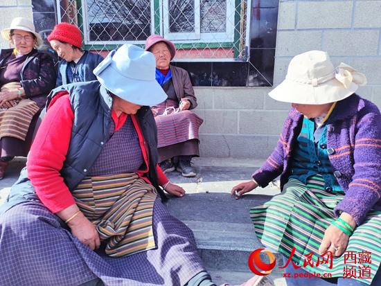 老人們曬著太陽(yáng)玩“阿布朵”(擲石子)。李海霞 攝