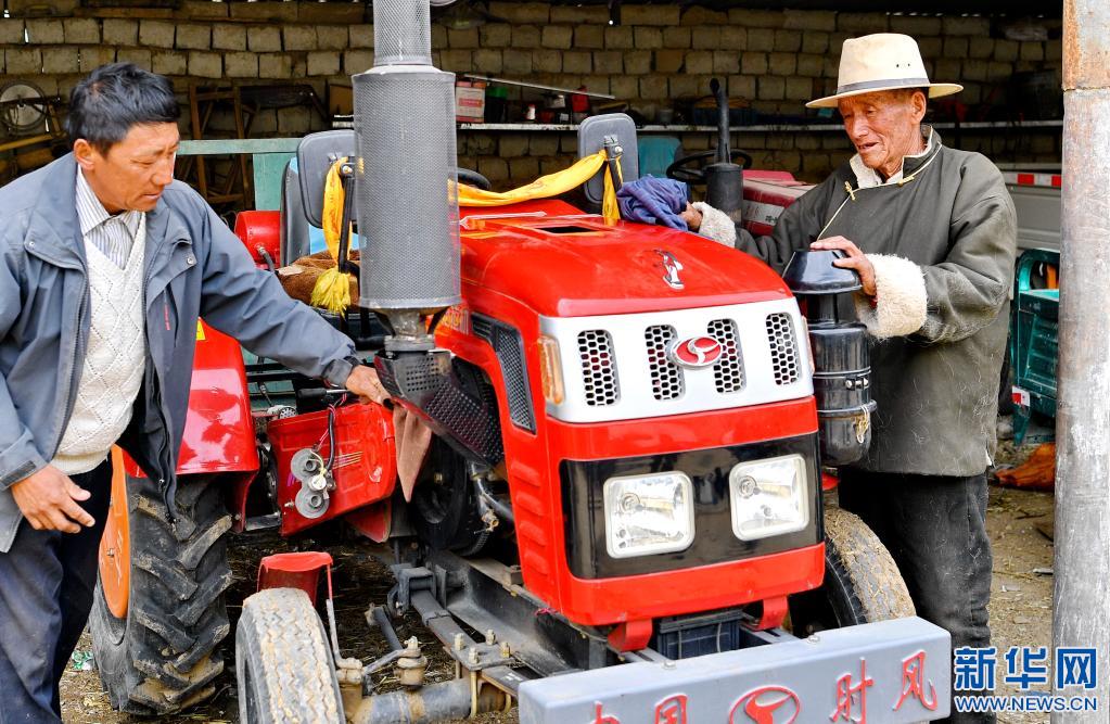 多扎木(右)在擦拭自家的拖拉機(jī)(3月20日攝)。新華社記者 張汝鋒 攝