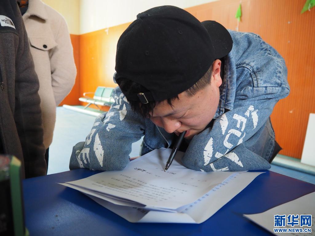 11日下午,位于西藏拉薩市的賽馬場(chǎng)正在舉行一場(chǎng)殘疾人創(chuàng)業(yè)滾動(dòng)資金發(fā)放儀式。岳曉天熟練地用嘴含著筆,在資金發(fā)放協(xié)議書上簽上了自己的名字,字跡美觀工整,絲毫看不出是用嘴含著筆寫的。