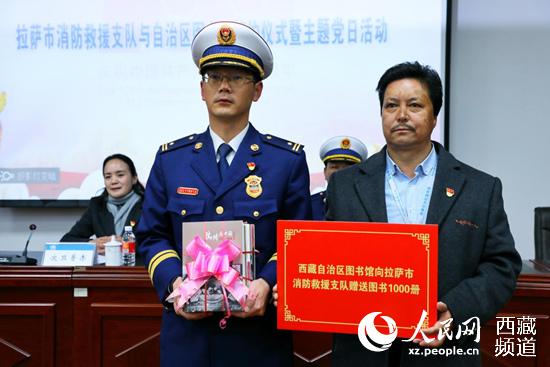 雙方還簽訂了共建協(xié)議,就圖書流動站建設(shè)、消防志愿服務(wù)隊建設(shè)和數(shù)字化電子圖書服務(wù)等達成一致。旦增卓瑪代表西藏自治區(qū)圖書館向拉薩市消防救援支隊贈送書籍1000冊。