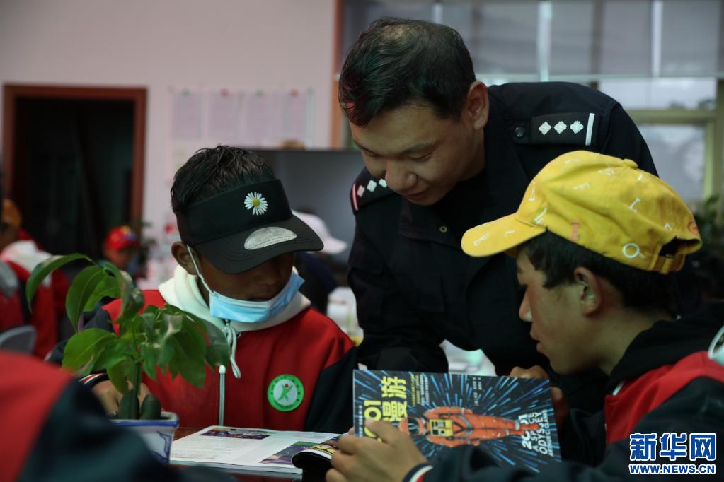 亞東出入境邊防檢查站圖書室對駐地中學(xué)學(xué)生開放,民警為學(xué)生講解書本知識(張雨強(qiáng)攝,新華社發(fā))