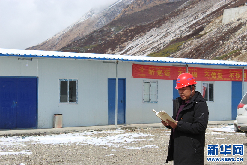 姚紅紀(jì)在拉康項目施工點為工人講黨課(4月24日攝)。新華網(wǎng)發(fā) (王雙雙攝)