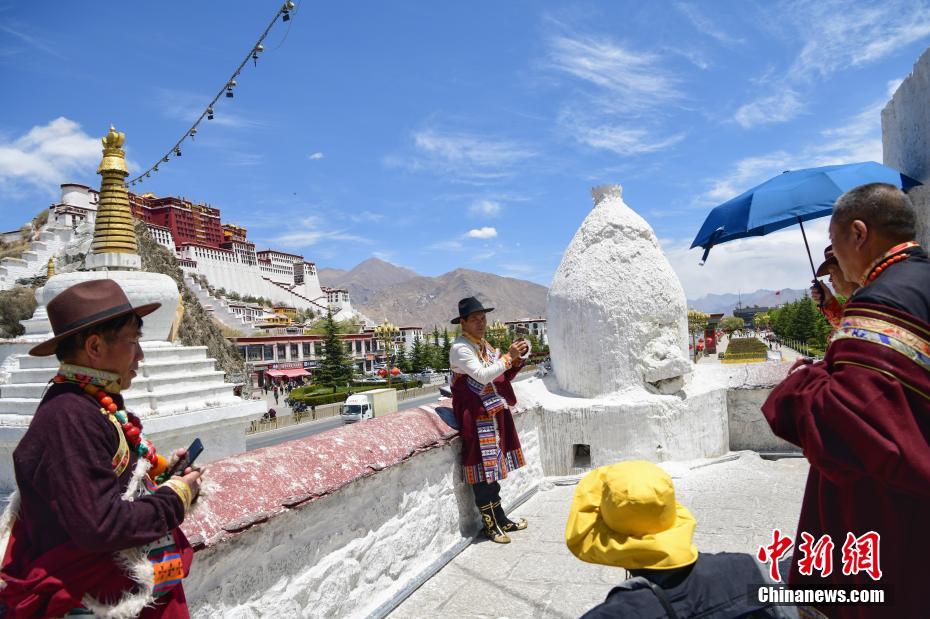 西藏官方發(fā)布數(shù)據(jù)顯示,2021年一季度,西藏接待國內(nèi)外游客171萬人次,同比增長2.4倍,實(shí)現(xiàn)旅游收入13.78億元人民幣,增長3.1倍?!拔逡弧奔倨趯⒅?,在拉薩布達(dá)拉宮、八廓街等地可以看到,身著藏族傳統(tǒng)服飾拍照留念的游客絡(luò)繹不絕,西藏旅游預(yù)計(jì)將迎來小高潮。圖為4月29日,藍(lán)天白云映襯下的布達(dá)拉宮。中新社發(fā) 貢嘎來松 攝