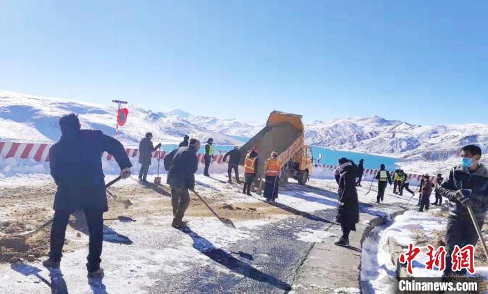 圖為通往羊卓雍措途中崗巴拉山此前發(fā)生持續(xù)降雪,養(yǎng)護(hù)工人進(jìn)行道路應(yīng)急保通現(xiàn)場(chǎng)。扎囊養(yǎng)護(hù)段供圖