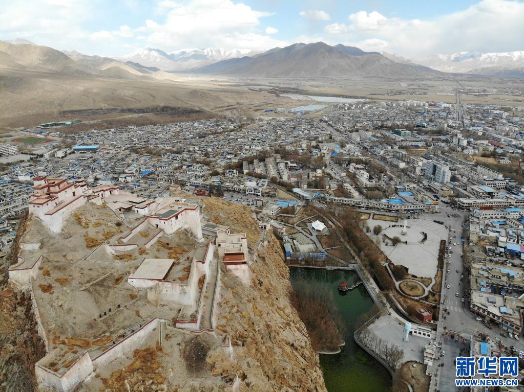 這是3月23日拍攝的江孜宗山古堡和江孜縣城(無人機(jī)照片)。新華社記者 孫瑞博 攝