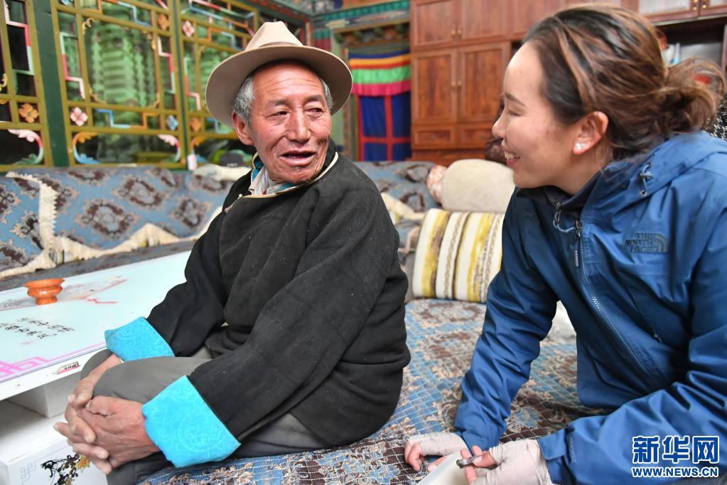 5月10日,多布杰老人(左)在江孜縣班久倫布村的家里和來訪的鄉(xiāng)干部聊天。新華社記者 孫瑞博 攝