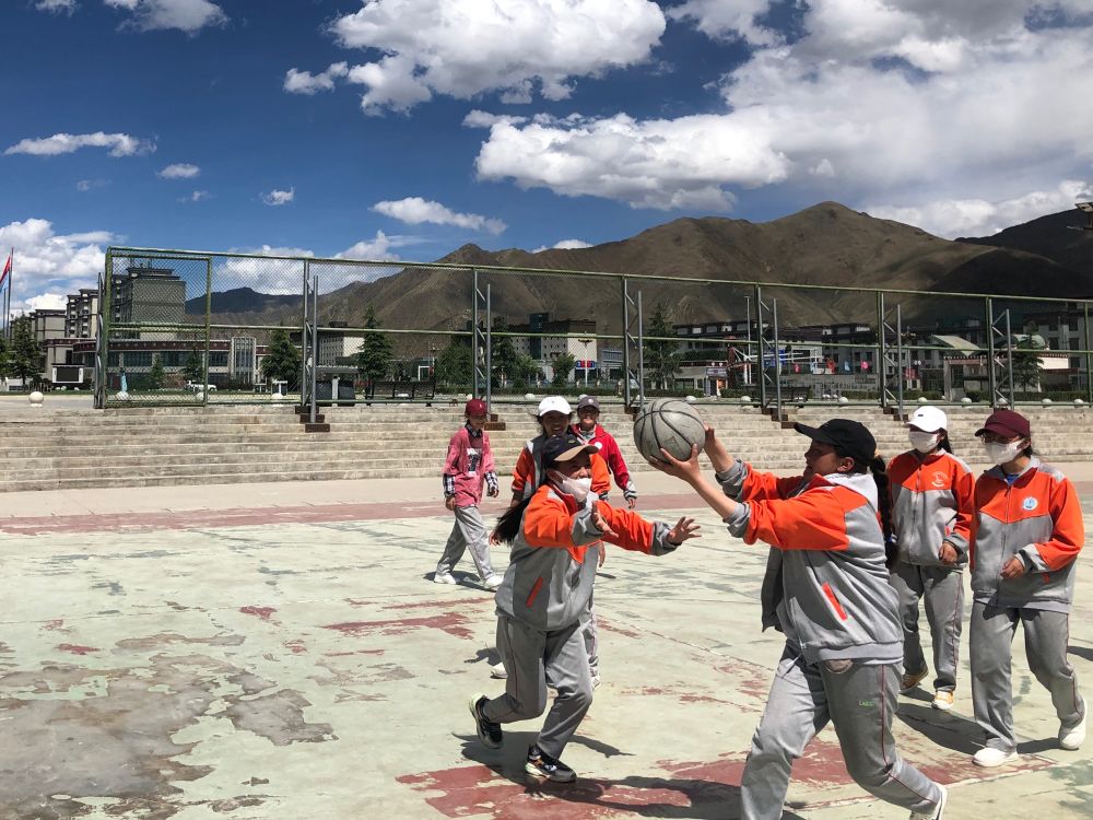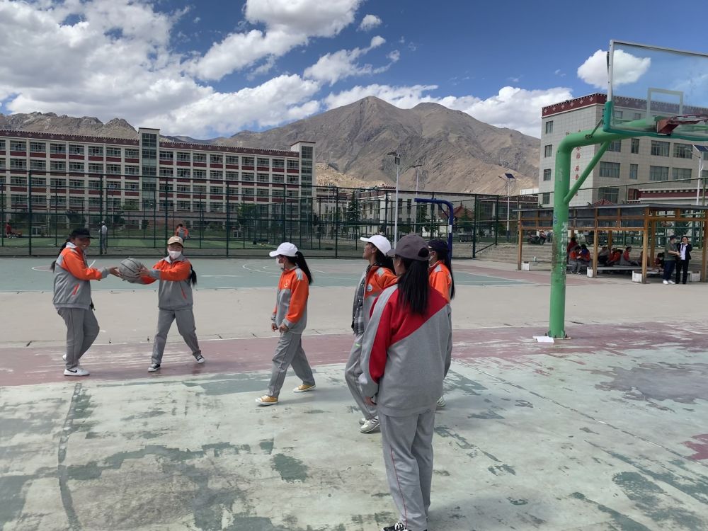 6月1日,西藏自治區(qū)拉薩市,拉薩那曲第二高級(jí)中學(xué)女學(xué)生次拉(右二)在跟男同學(xué)打籃球。新華社記者齊菲攝