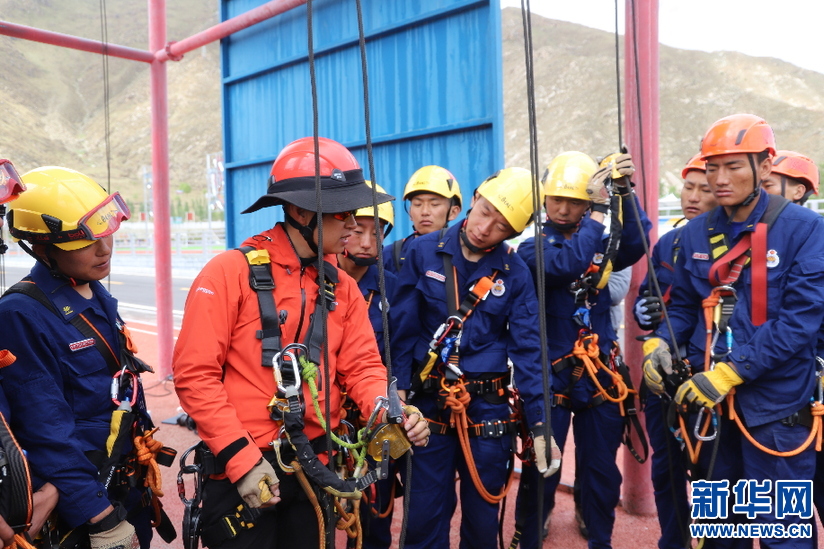教練在為隊員們進行繩索救援授課(6月8日攝) 。(新華網(wǎng)發(fā) 劉論剛攝)