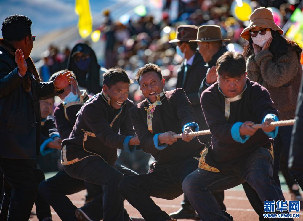 圖為2020年11月29日,山南市扎囊縣的農(nóng)牧民在該縣首屆農(nóng)民運動會中參加拔河比賽,在農(nóng)閑期間參與全民健身的現(xiàn)場。新華社記者 普布扎西 攝