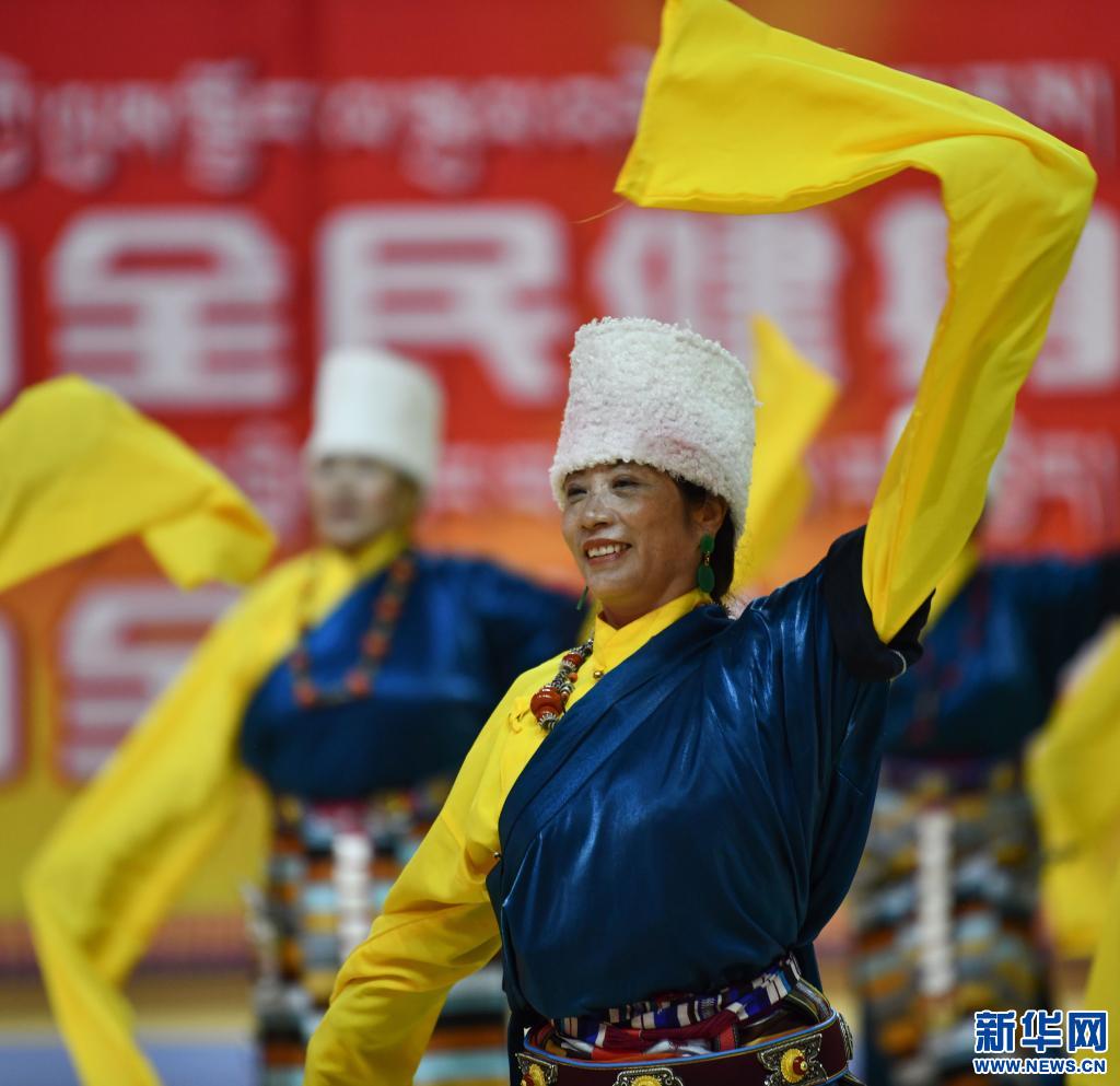 圖為2020年8月8日,2020年西藏自治區(qū)“全民健身日”活動啟動儀式在拉薩舉行的活動現(xiàn)場,“龍王潭羌塘鍋莊林”健身隊在啟動儀式上表演那曲鍋莊串燒。新華社記者 晉美多吉 攝