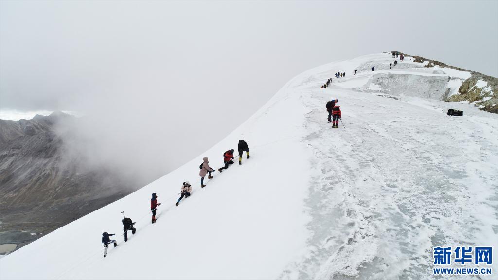 2020年10月5日,第十八屆“第三極”中國西藏登山大會上登山愛好者在向洛堆峰峰頂進發(fā)(無人機拍攝)新華社記者 孫非 攝