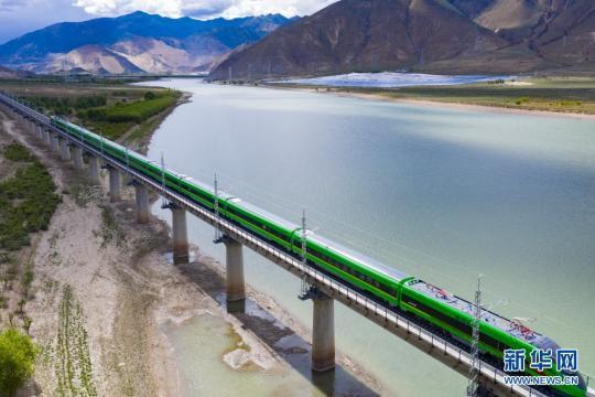 試運行的復(fù)興號列車行駛在雅魯藏布江上(6月16日攝,無人機(jī)照片)。新華社記者 普布扎西 攝
