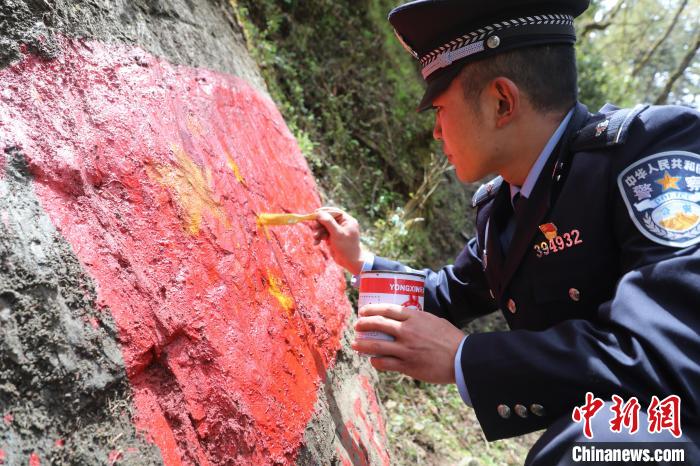 圖為玉麥邊境派出所移民管理警察在邊境一線對國旗、中國字樣等主權(quán)標(biāo)志物描紅。山南邊境管理支隊(duì)供圖