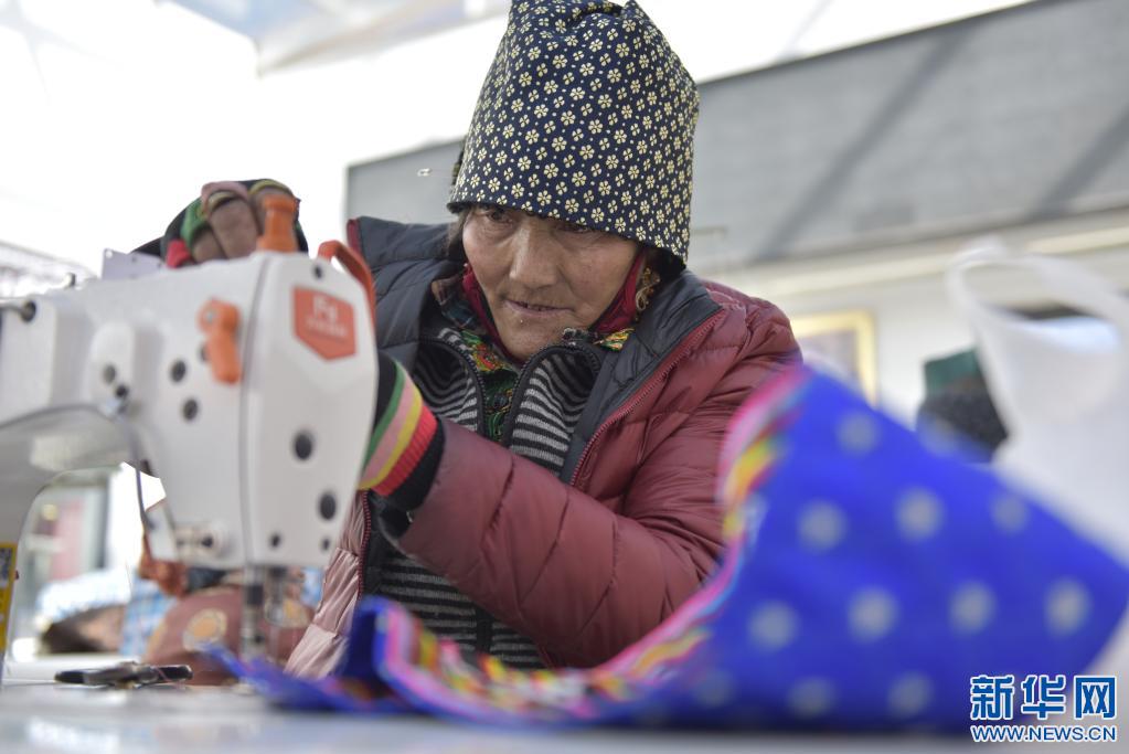 在民族服裝縫紉制造農(nóng)民專業(yè)合作社里,拉卓正在縫制產(chǎn)品(2021年2月2日攝)。 新華社記者田金文 攝