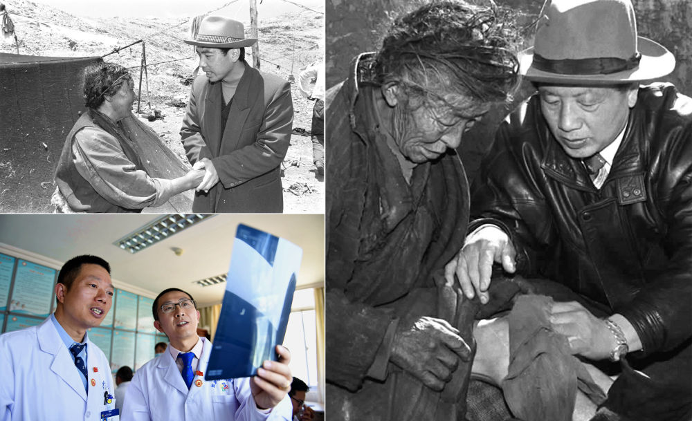 左上圖為來自陜西的援藏干部、阿里日土縣副縣長賈冗勇深入牧區(qū),幫助藏族牧民解決生產、生活的實際困難(新華社記者土登攝,1997年11月11日發(fā));左下圖為2017年8月3日,北京積水潭醫(yī)院援藏醫(yī)生龔曉峰(右)和北京天壇醫(yī)院援藏醫(yī)生李家謀在拉薩市人民醫(yī)院骨科病房內查看患者的X光片,進行工作交接(新華社記者晉美多吉攝);右圖為孔繁森(右)在阿里日土縣過巴鄉(xiāng)為孤寡老人益西卓瑪治?。ㄐ氯A社記者土登攝,1994年12月26日發(fā))。