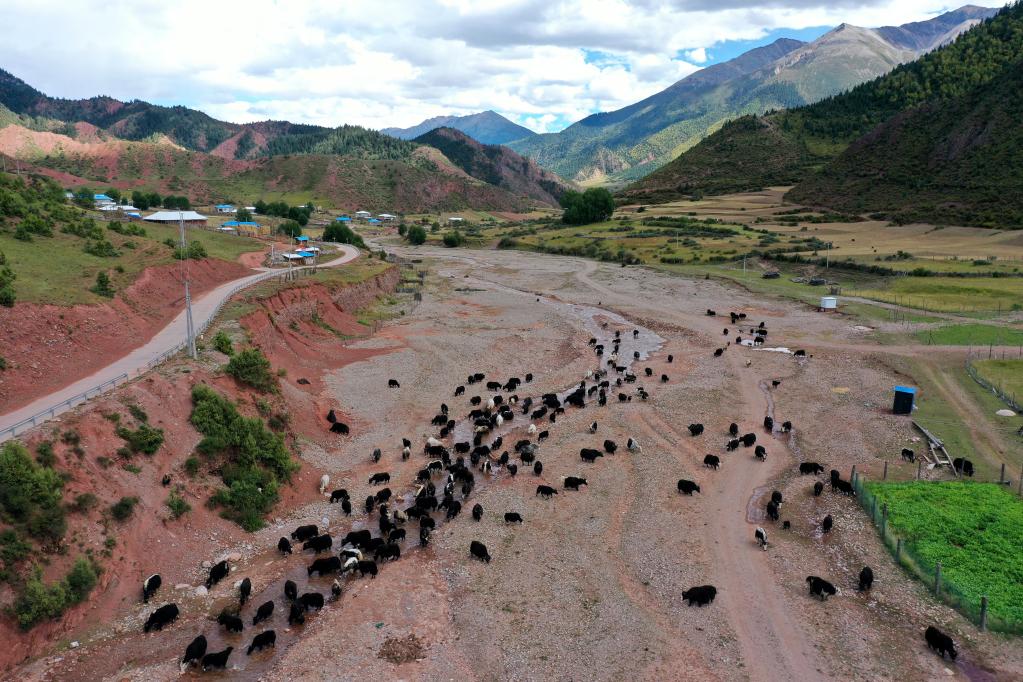 昌都市類烏齊縣賓達鄉(xiāng)央宗村央宗牦牛育肥基地的牦牛(2020年9月21日攝,無人機照片)。新華社記者 詹彥 攝