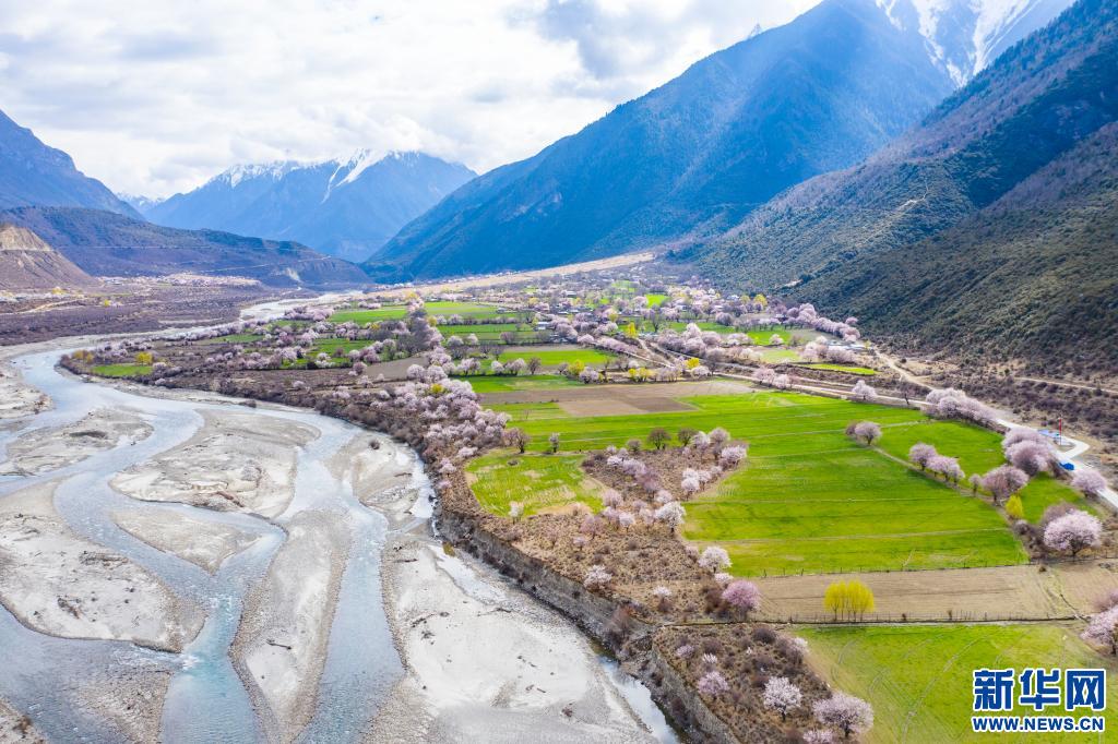 西藏林芝市波密縣境內(nèi)桃花盛開的田園風(fēng)光(2020年3月26日攝,無人機(jī)照片)。新華社記者普布扎西 攝