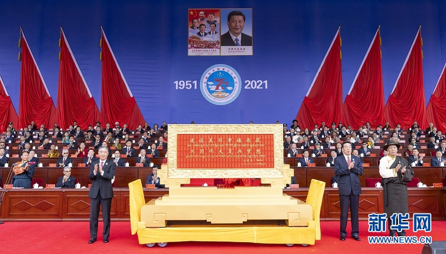 8月19日,慶祝西藏和平解放70周年大會在拉薩隆重舉行。中共中央政治局常委、全國政協(xié)主席、中央代表團(tuán)團(tuán)長汪洋向西藏自治區(qū)、西藏軍區(qū)、武警西藏總隊、西藏自治區(qū)政法系統(tǒng)、中國佛協(xié)西藏分會分別贈送了中共中央總書記、國家主席、中央軍委主席習(xí)近平題詞的“建設(shè)美麗幸福西藏 共圓偉大復(fù)興夢想”賀匾和賀幛。新華社記者 黃敬文 攝