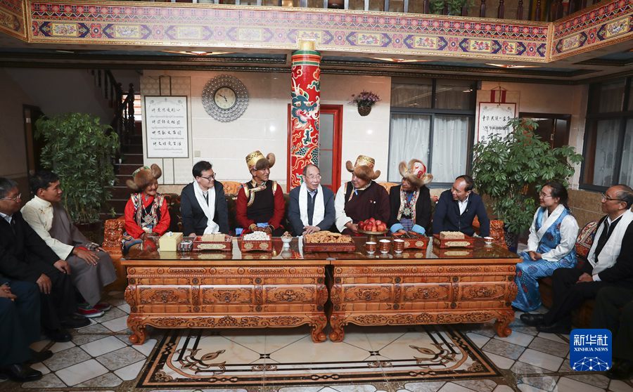 8月20日,中央代表團山南、日喀則分團帶著以習近平同志為核心的黨中央的深切關懷和全國人民的深情祝福,分別看望慰問當?shù)馗髯甯鹘绺刹咳罕?。這是中共中央書記處書記、中央統(tǒng)戰(zhàn)部部長、中央代表團副團長尤權率山南分團在山南市乃東區(qū)昌珠鎮(zhèn)扎西曲登社區(qū)走進居民次仁家看望慰問。新華社記者 丁林 攝