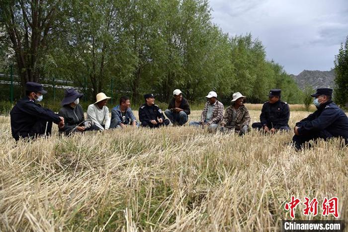 一陣忙碌過后,大家圍攏在田里聊變化說發(fā)展。慶祝西藏和平解放70周年大會剛剛舉行,大家聊著現(xiàn)場觀禮、收聽收看的感受。參加現(xiàn)場大會的民警高揚向大家分享現(xiàn)場感受,講述自己在西藏生活學習工作22年的發(fā)展變化和入警初心。歡聲笑語過后,大家又忙碌起來。田間地頭藏青藍的身影,與金黃麥地構(gòu)成一幅加強民族團結(jié)、警民魚水情深的動人畫卷。