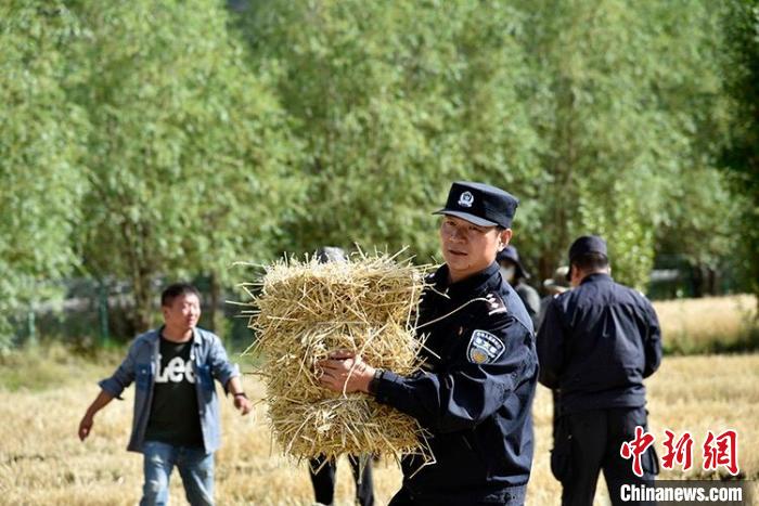 金黃的麥穗,在微風下吹拂。來到邊巴次仁家的田地,民警們與駐村工作隊隊員三三兩兩忙碌起來,幾個人拿起鐮刀趕著在收割機到來前收割倒地的麥子,另外兩個人又忙著將打包好的麥稈裝車。經(jīng)過一個多小時的勞作,大家齊心協(xié)力幫著將脫谷麥粒裝進農(nóng)用車里。