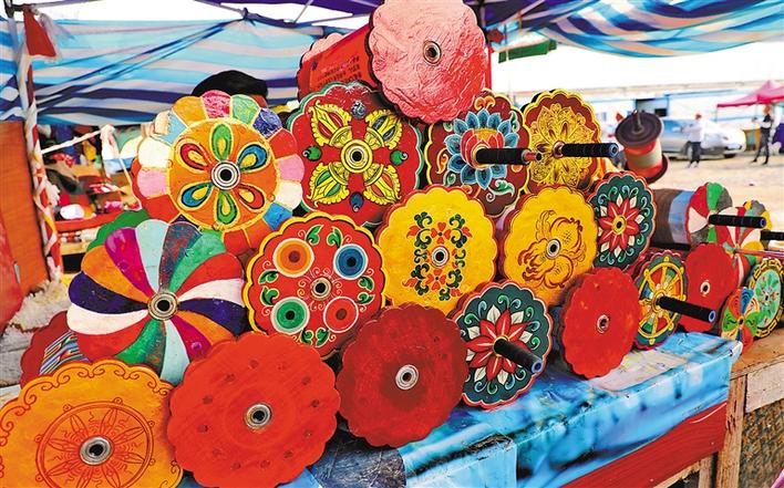 線軸也是藏式斗風(fēng)箏時的重要武器。線軸,藏語稱為“擴羅”,是用幾根小圓木和兩個等圓的木板做成的,像個車輪,有軸心和軸桿,線就繞在輪軸上。線軸有大小之分,線軸越大,收放線的速度越快。參賽者根據(jù)自己的年齡大小、手掌大小、風(fēng)箏大小以及風(fēng)力大小等因素來選擇線軸,只有當(dāng)線軸大小與實際情況相匹配,操作起來才得心應(yīng)手。