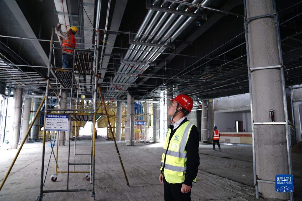 張磊正在查看項目室內(nèi)施工現(xiàn)場(2021年9月18日攝)。新華社記者 劉洪明 攝