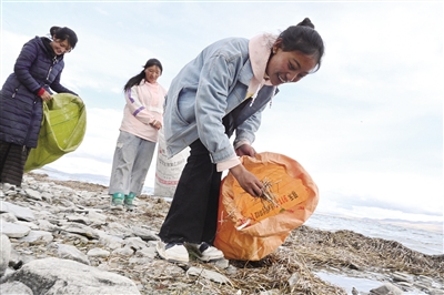 在瑪旁雍措國家級濕地自然保護區(qū)吉吾管理站,20歲的濕地保護管護員次仁旺姆和同伴在水邊撿拾垃圾。