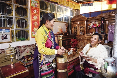 居住在阿里噶爾縣康樂新居的斯瓊正在品嘗妻子普珍制作的酥油茶。2017年,斯瓊一家從海拔4570米的改則縣麻米鄉(xiāng)搬入了噶爾縣生態(tài)安置小區(qū)康樂新居。據(jù)了解,根據(jù)西藏自治區(qū)黨委、政府的決策部署,當?shù)卣畬0?700米以上極高海拔地區(qū)實施生態(tài)搬遷,實現(xiàn)群眾脫貧致富和生態(tài)環(huán)境改善。