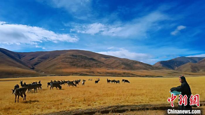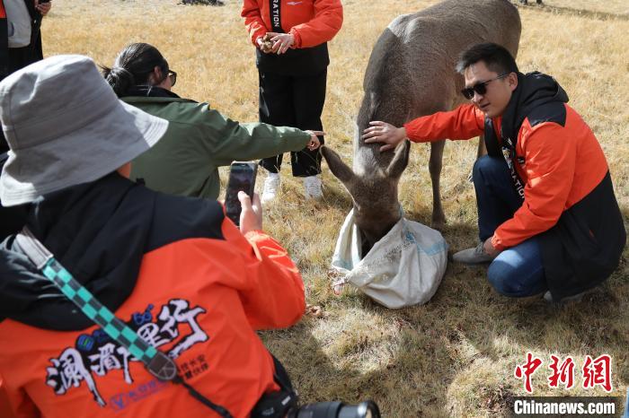 圖為西藏類(lèi)烏齊馬鹿國(guó)家級(jí)自然保護(hù)區(qū)的管護(hù)員正在飼喂馬鹿。冉文娟 攝