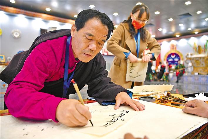圖為非遺傳承人展示藏文書(shū)法。記者 旦增西旦 攝