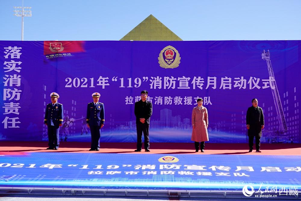 拉薩市2021年“119”消防宣傳月啟動(dòng)儀式現(xiàn)場。拉薩市委常委 、常務(wù)副市長占堆(左三)出席儀式并講話。人民網(wǎng) 次仁羅布攝