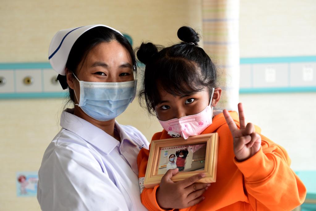 11月2日,4名已康復(fù)的先心病患兒在出院前和醫(yī)護人員等合影。黃博涵 攝