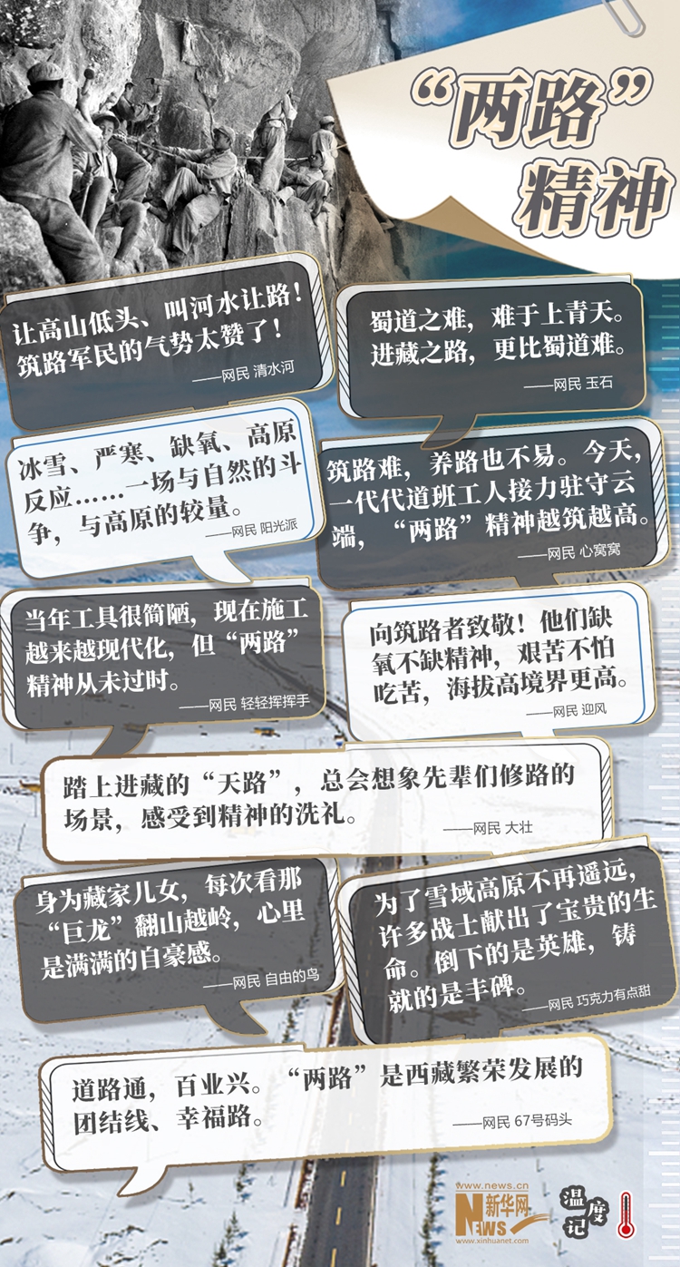 “天路”巍峨,精神閃光。當(dāng)雪域高原換了人間,新一代建設(shè)者正接過接力棒,在新時代續(xù)寫著新的傳奇。“今天,一代代道班工人接力駐守云端,‘兩路’精神越筑越高”,正如網(wǎng)民所說,無論過去、現(xiàn)在和將來,“兩路”精神都是西藏各族人民建設(shè)幸福家園的力量源泉和精神動力,也必將激勵中華兒女為了更加美好的明天繼續(xù)奮斗、前行。(文字:馬若虎 海報設(shè)計:王曄)