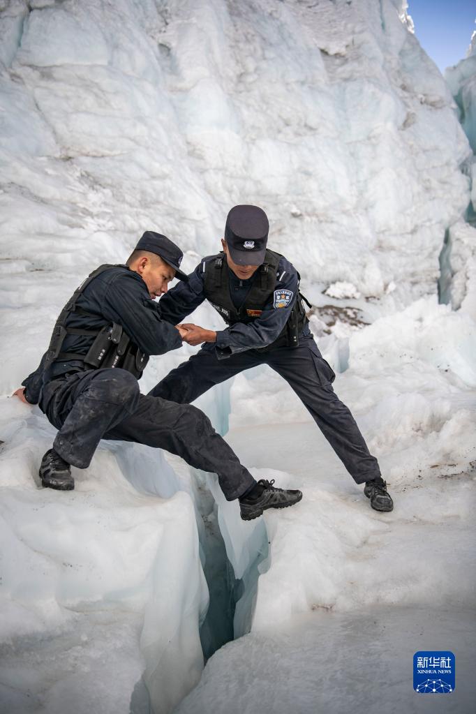 普瑪江塘邊境派出所的移民管理警察在巡邏途中跨越冰裂縫(11月20日攝)。新華社記者 王沁鷗 攝